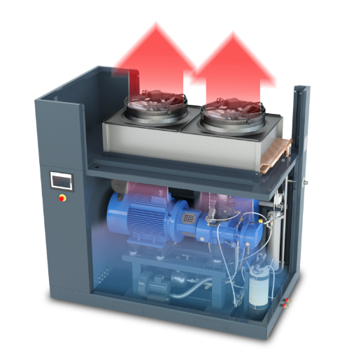 位于顶部的特殊设计低噪音轴流风扇将冷却器、电机等部件产生的热量强制排出机组,使空压机内部始终在一个理想温度下。独特形状的扇叶,显著降低排风噪音。